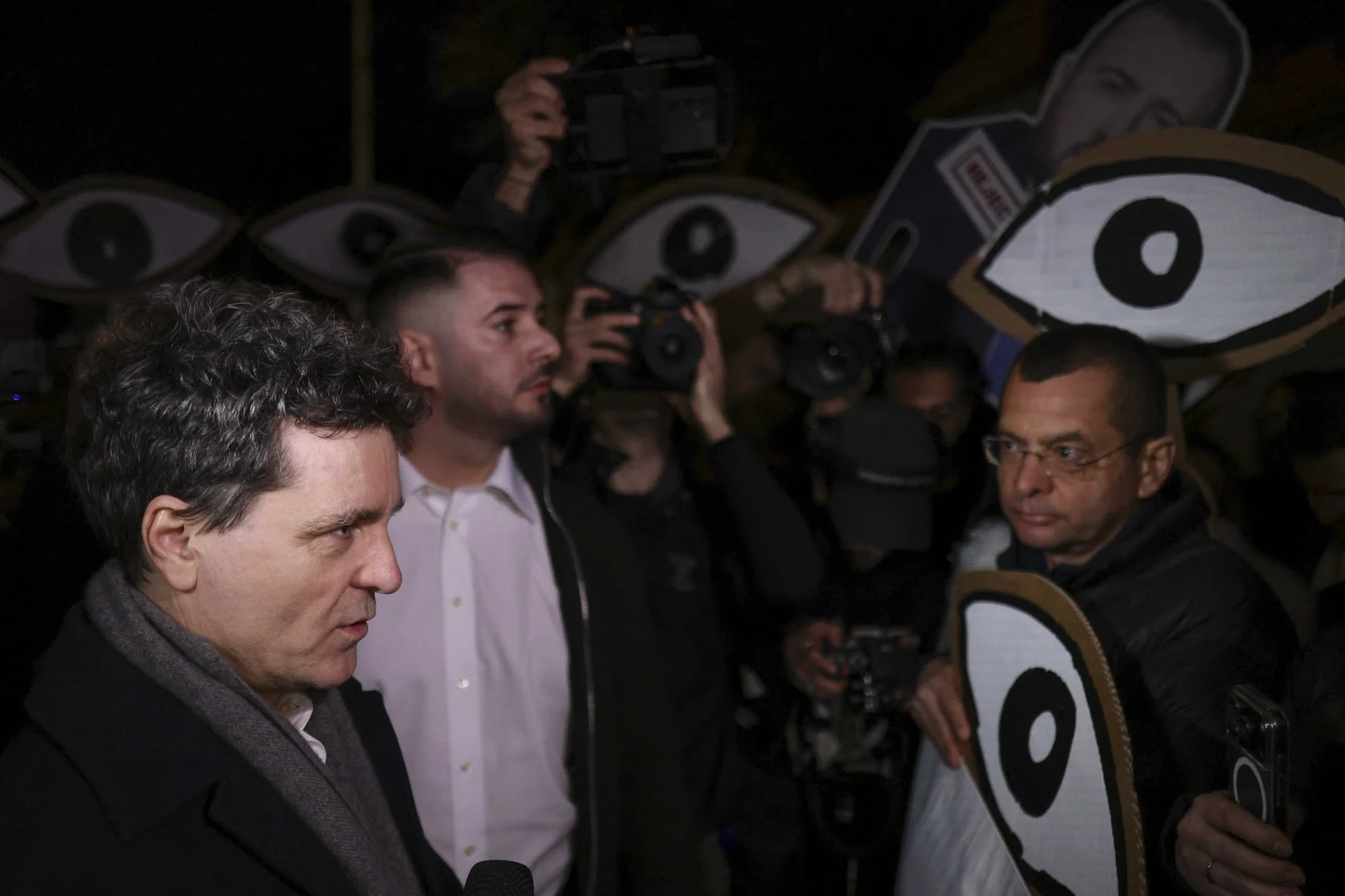 President Nicusor Dan speaks with protesters opposing judicial appointments.